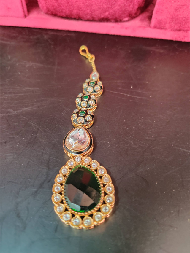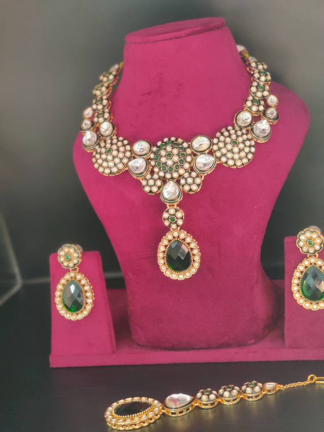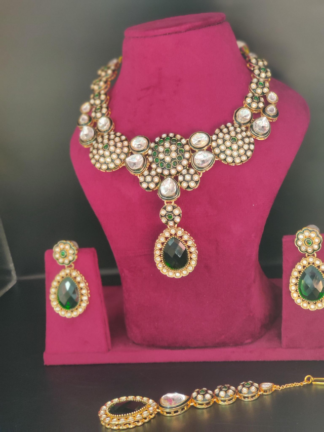 Moissanite Stone Jewelry set I Indian JewelryI Green Necklace with Maang Tikka I Indian Jewelry Sets I Polki Sets I Meenakaari Jewelery Set